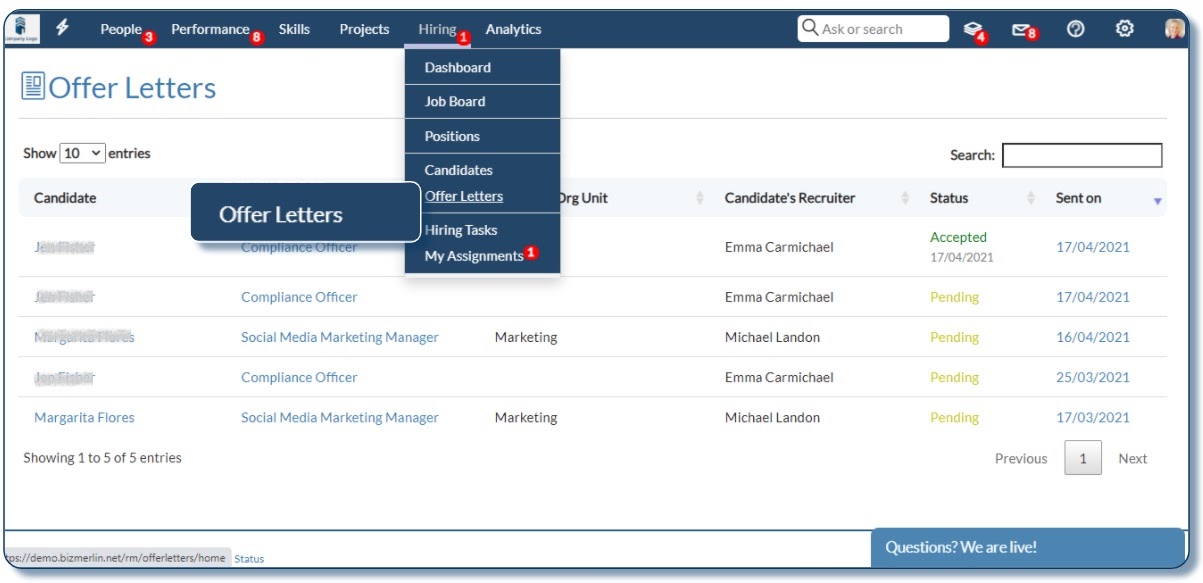 You can navigate to this page by going to the Hiring menu–>Offer Letters