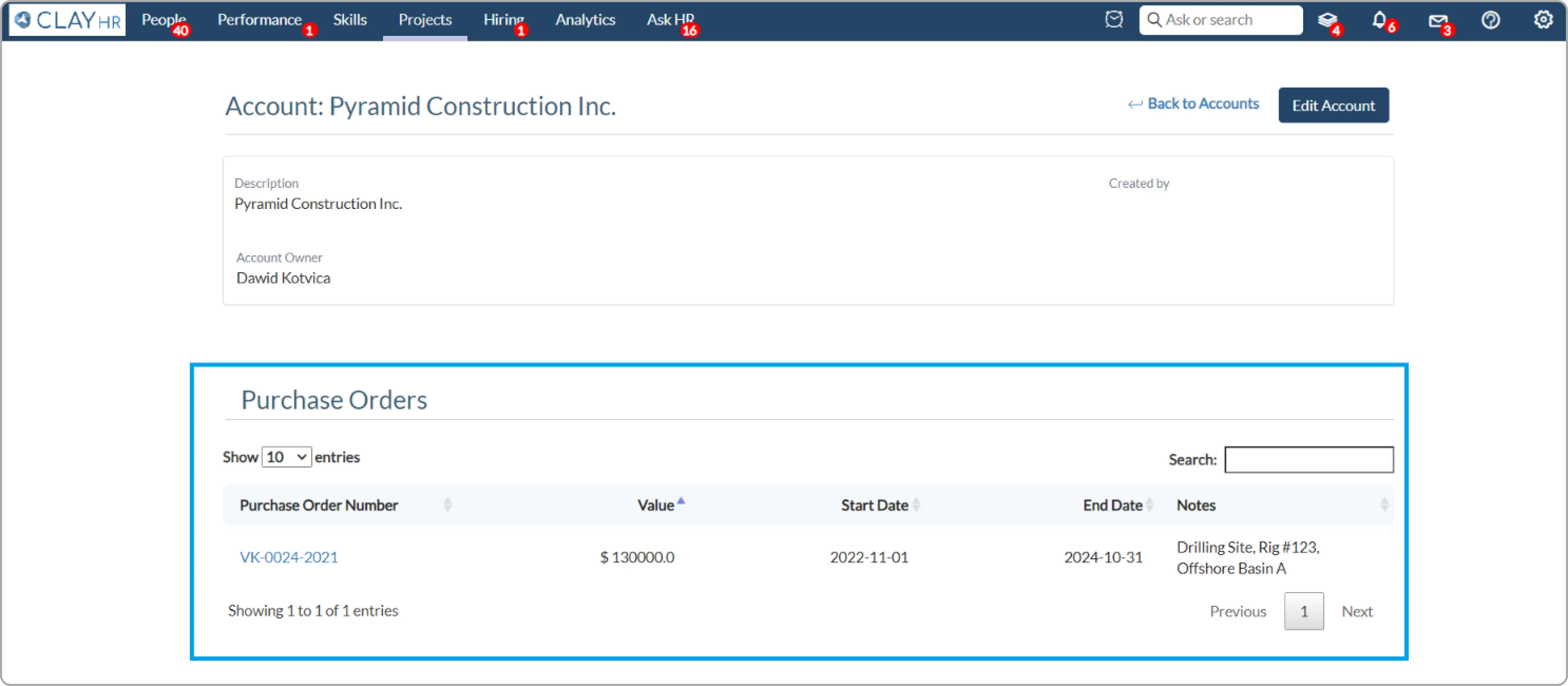 - The list of purchase orders linked to a particular account is shown on the account view page.
