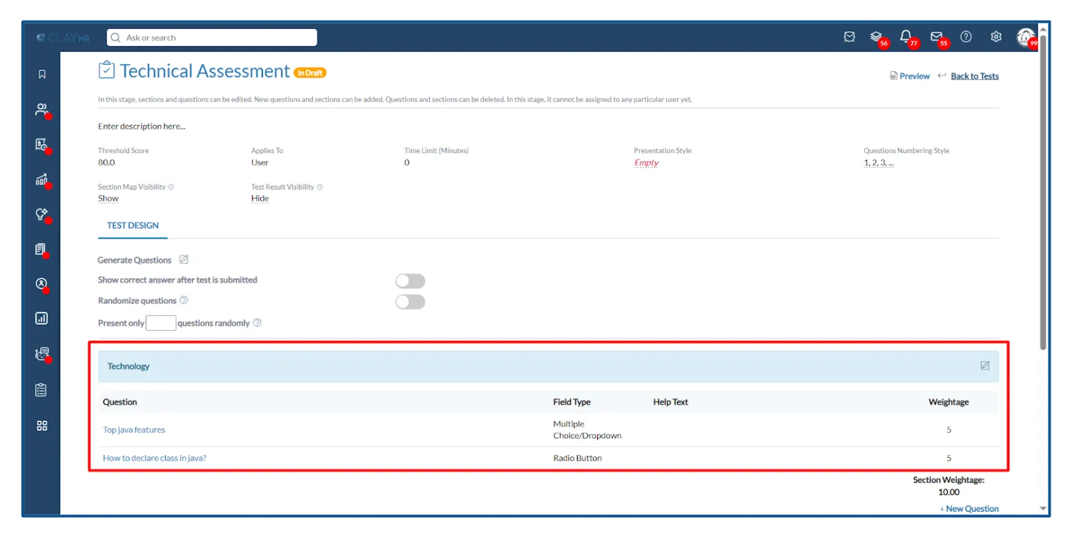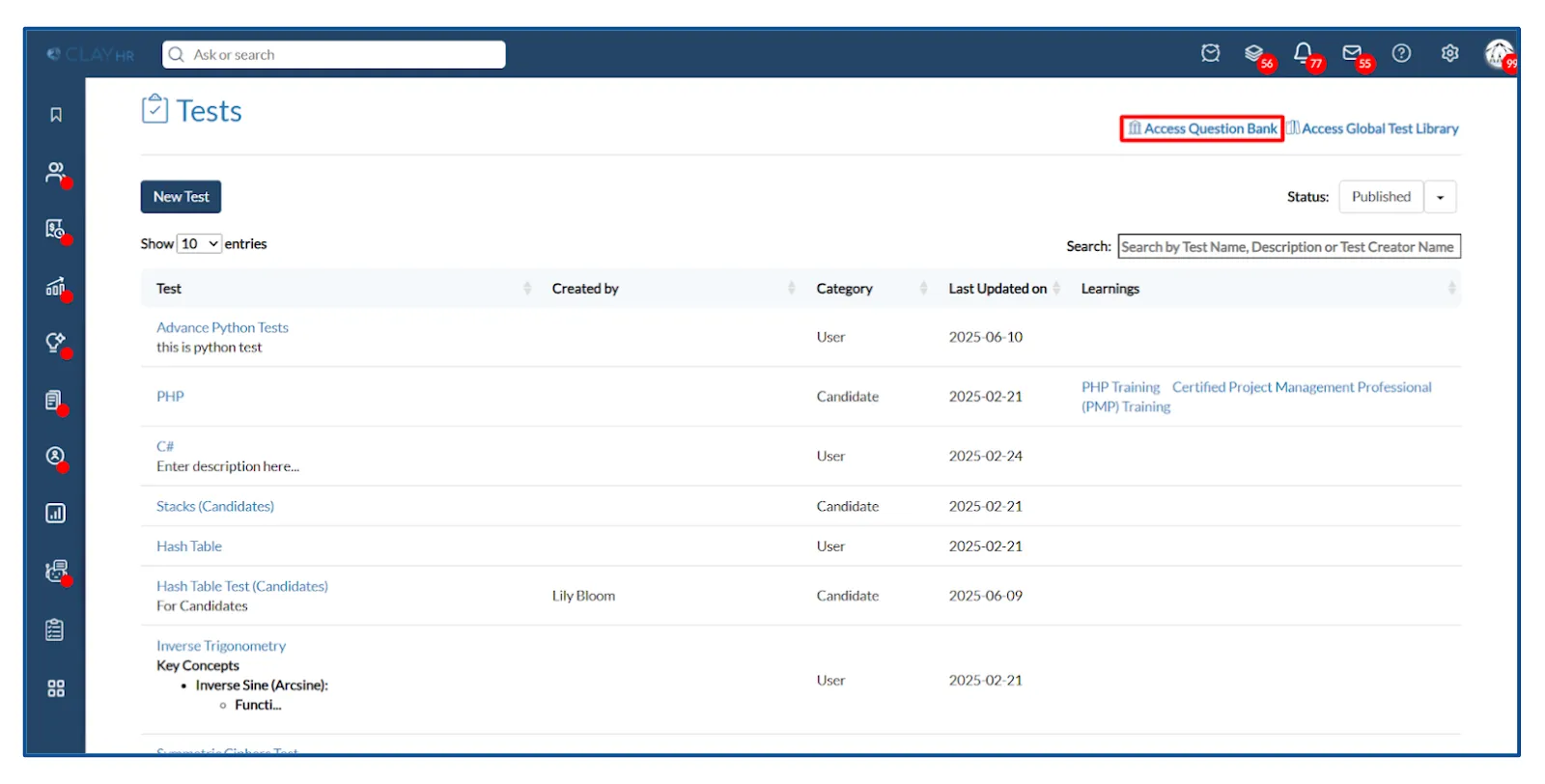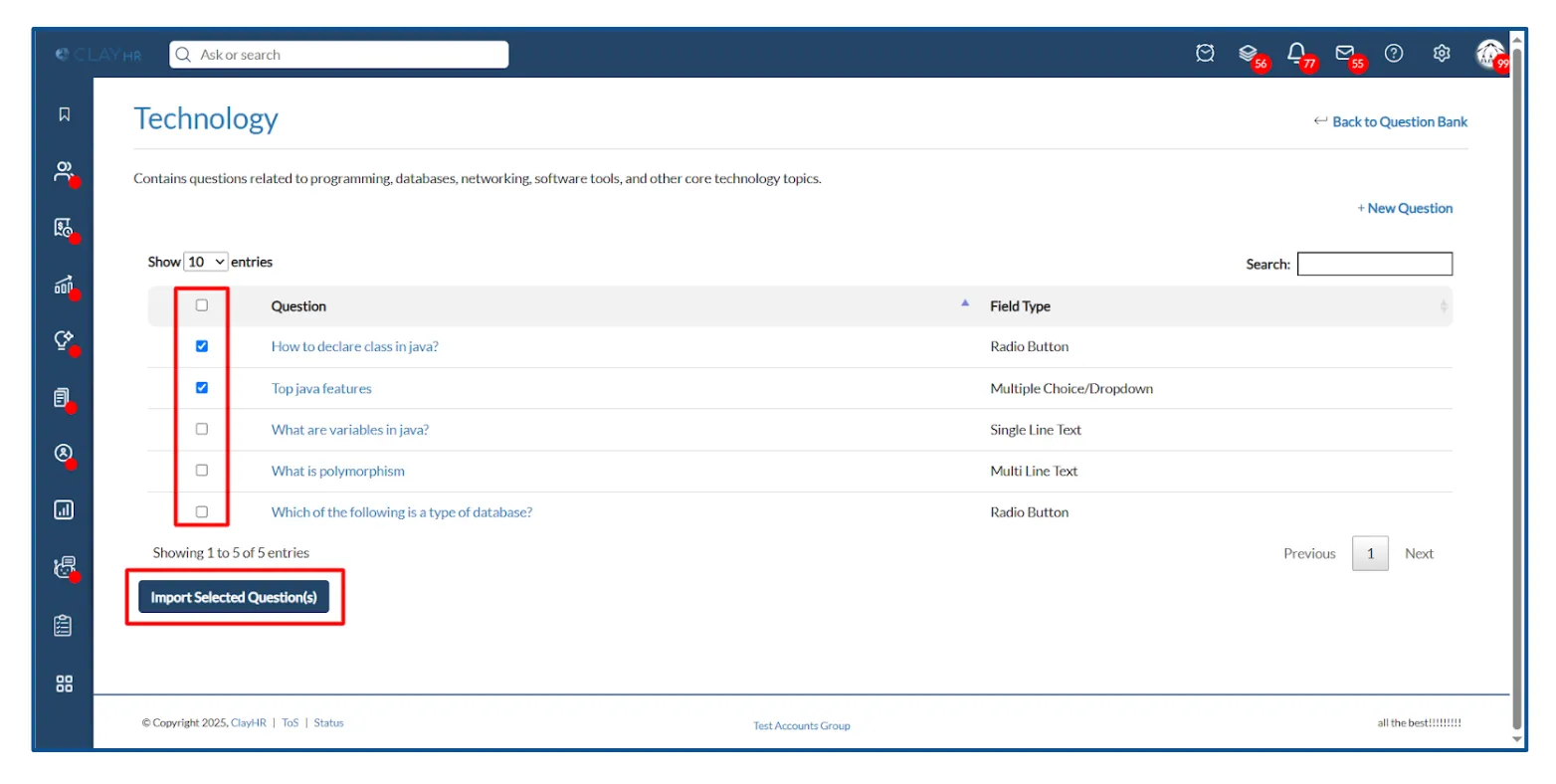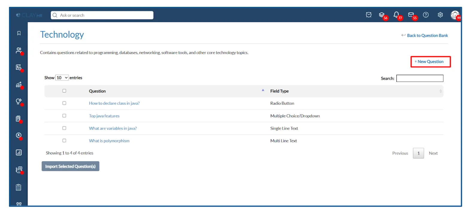 ClayHR’s Question Bank lets you easily reuse/import existing questions in your tests without creating them from scratch. This feature helps ensure consistency across assessments and saves you time just a few clicks and you are done!