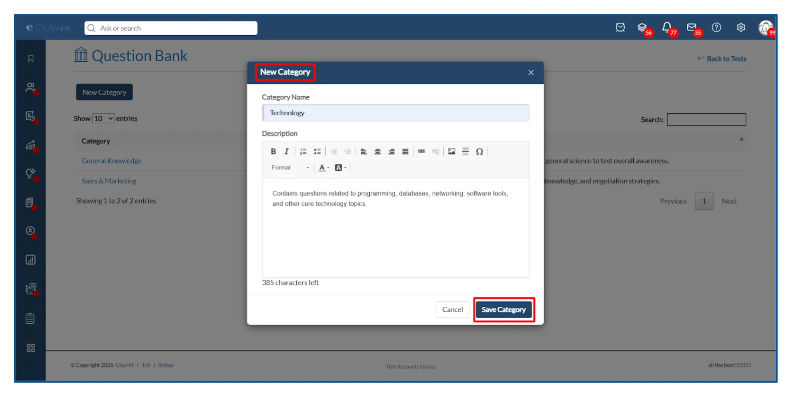 - To create a new category for the Question Bank, click on the "New Category" button.