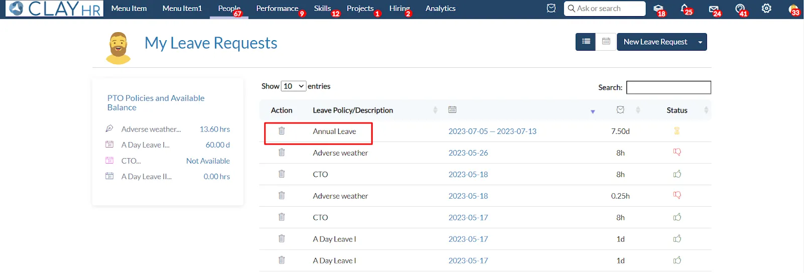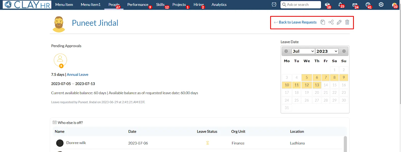 - Another way to delete a leave request is by clicking on the delete icon on the top right on the leave detail page.