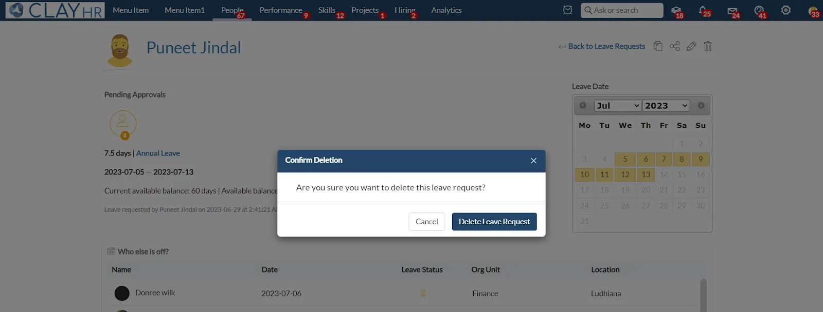 Note: You can delete the leave request only if it is not approved. In the case of an approved leave request, only the users who have the PTO management permission or the site admin will be able to delete the leave request. Once the leave is computed, no one can delete the leave request but it can be recalled.