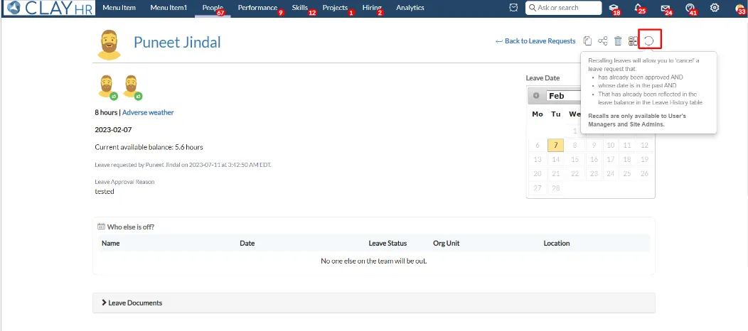 - The recall option is only visible to users with either PTO Management permission or Site Administrator.