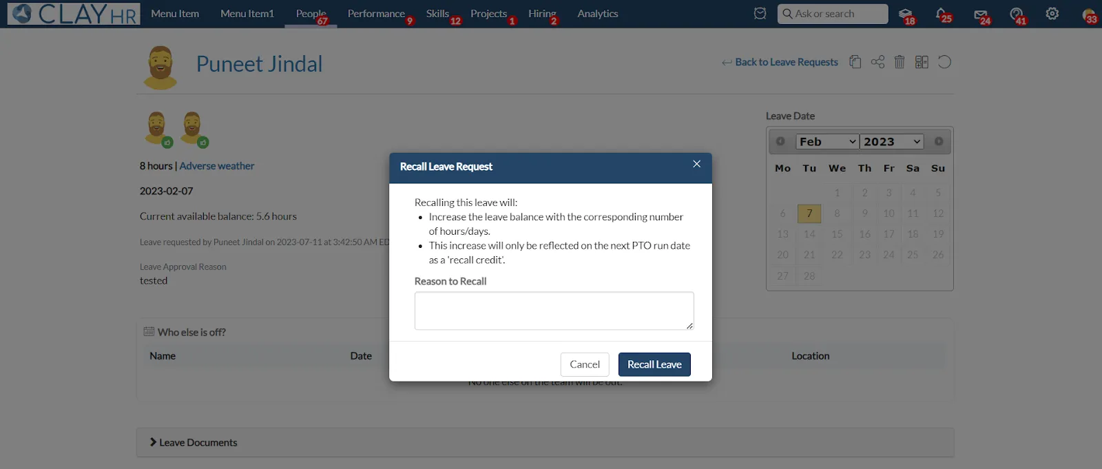 add the reason for recalling the leave and proceed with “Recall Leave”.