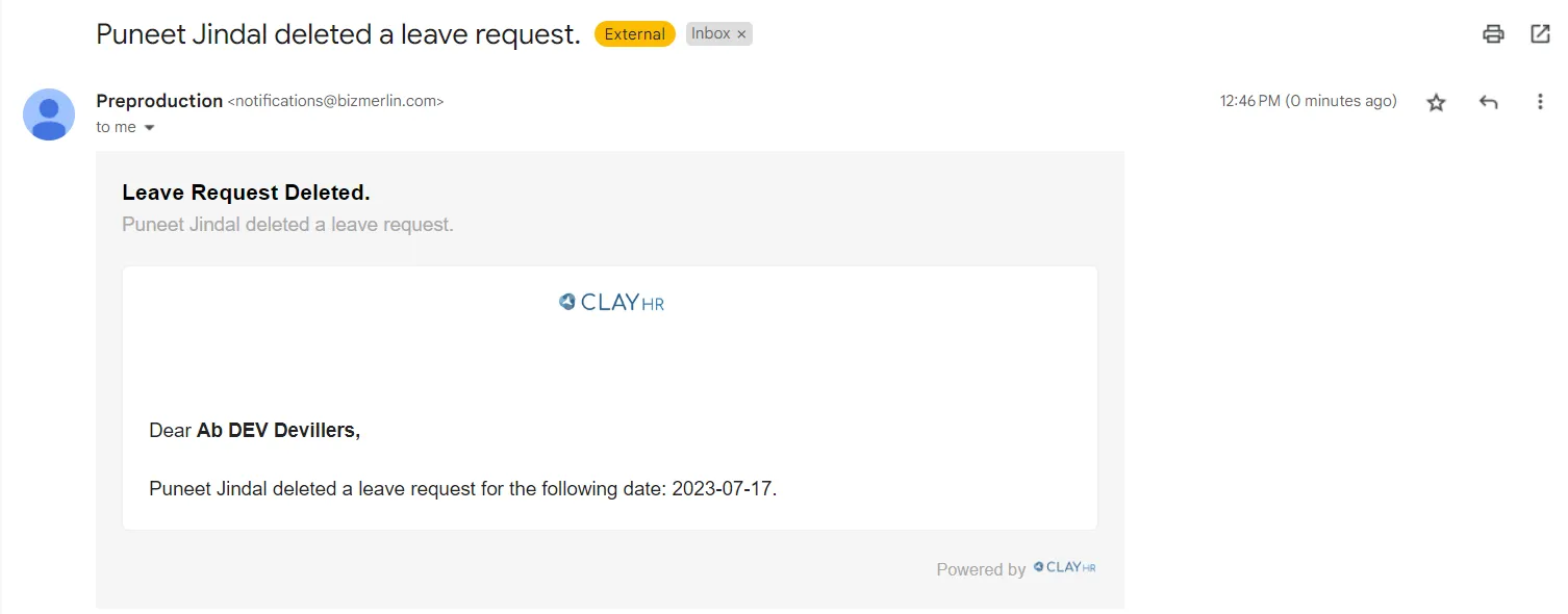 - After the leave deletion, an email notification will be sent to the User’s Manager (if no approval flow is defined) or else to all the users in the approval flow along with the user whose leave has been deleted.