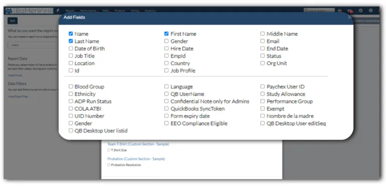 - Select the “Entity” such as users, goals, timecards after that next step is to “Add fields” to your report.