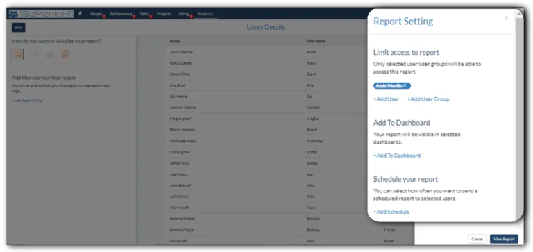 - Then, “Proceed to report settings”. In which you can “add user” or “a user group” who will be able to access this report.