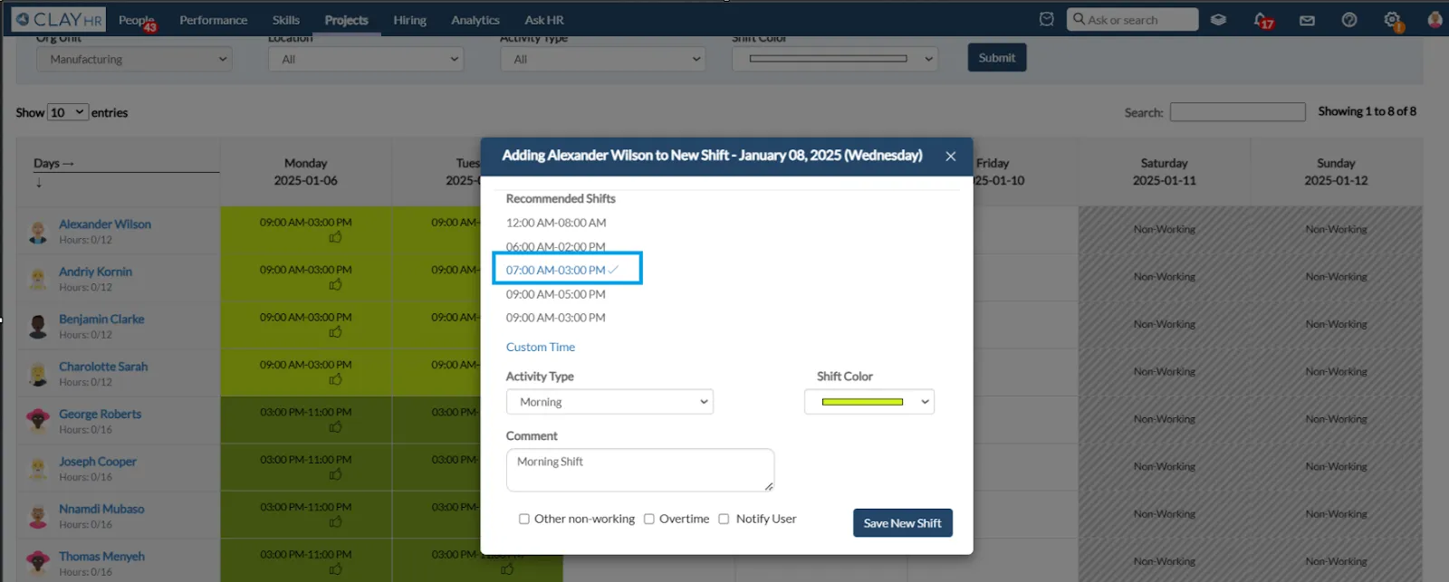 - After allocating the shift, click on the “Save New Shift” button to save the shift timing.
