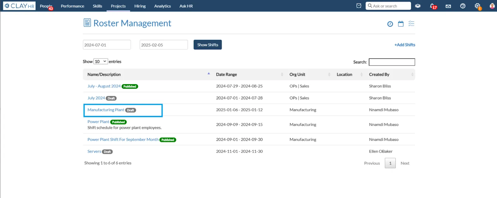 - On the “Roster Management” home page, you will see the list of created shifts.