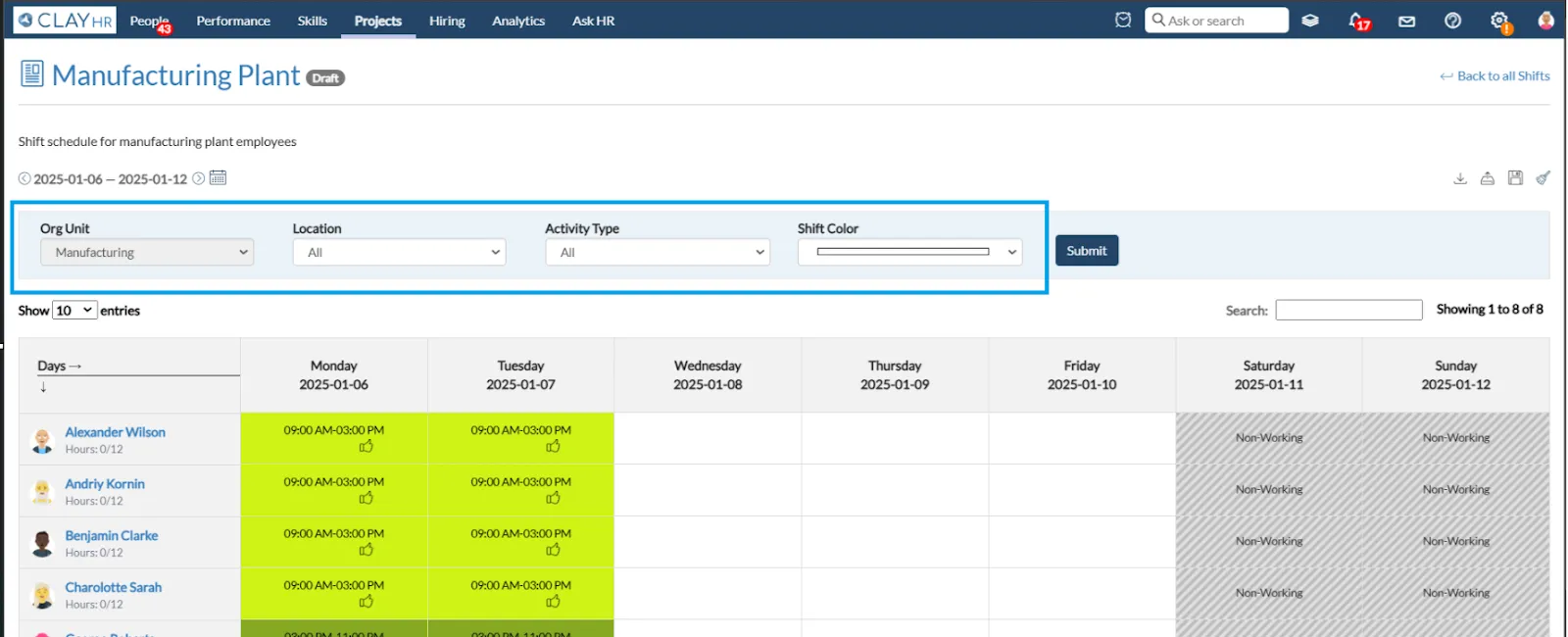 - You can apply filters such as "Location", and "Org-Unit" to view users associated with a specific location or organizational unit. Additionally, you can filter shift timings based on activity type and shift color.