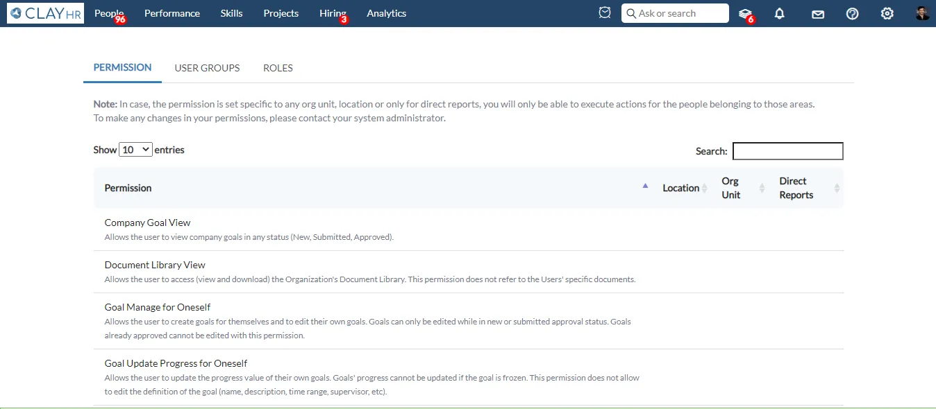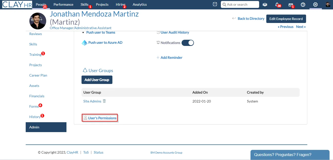 This feature enables the site admin to view the permissions assigned to a specific user from its employee record.