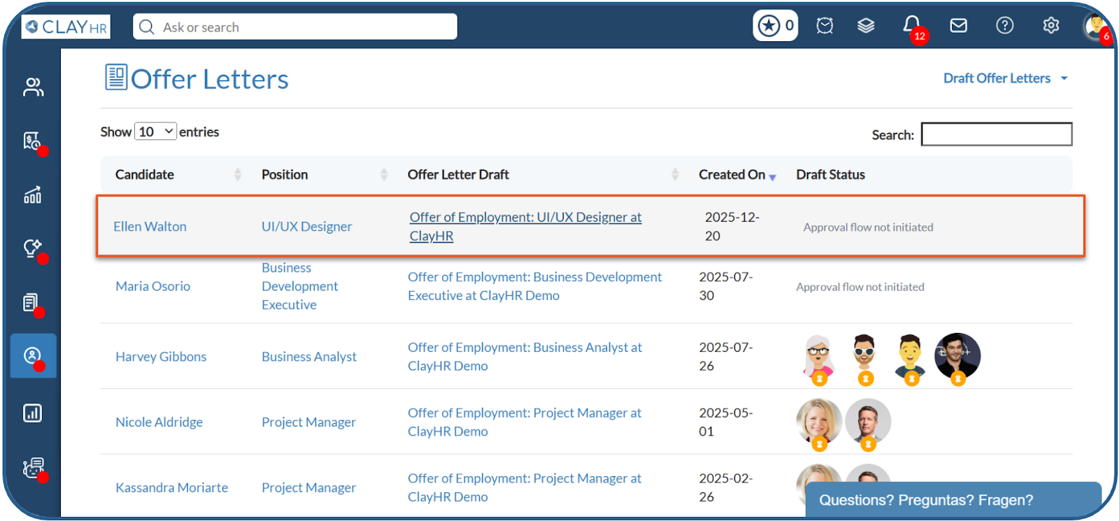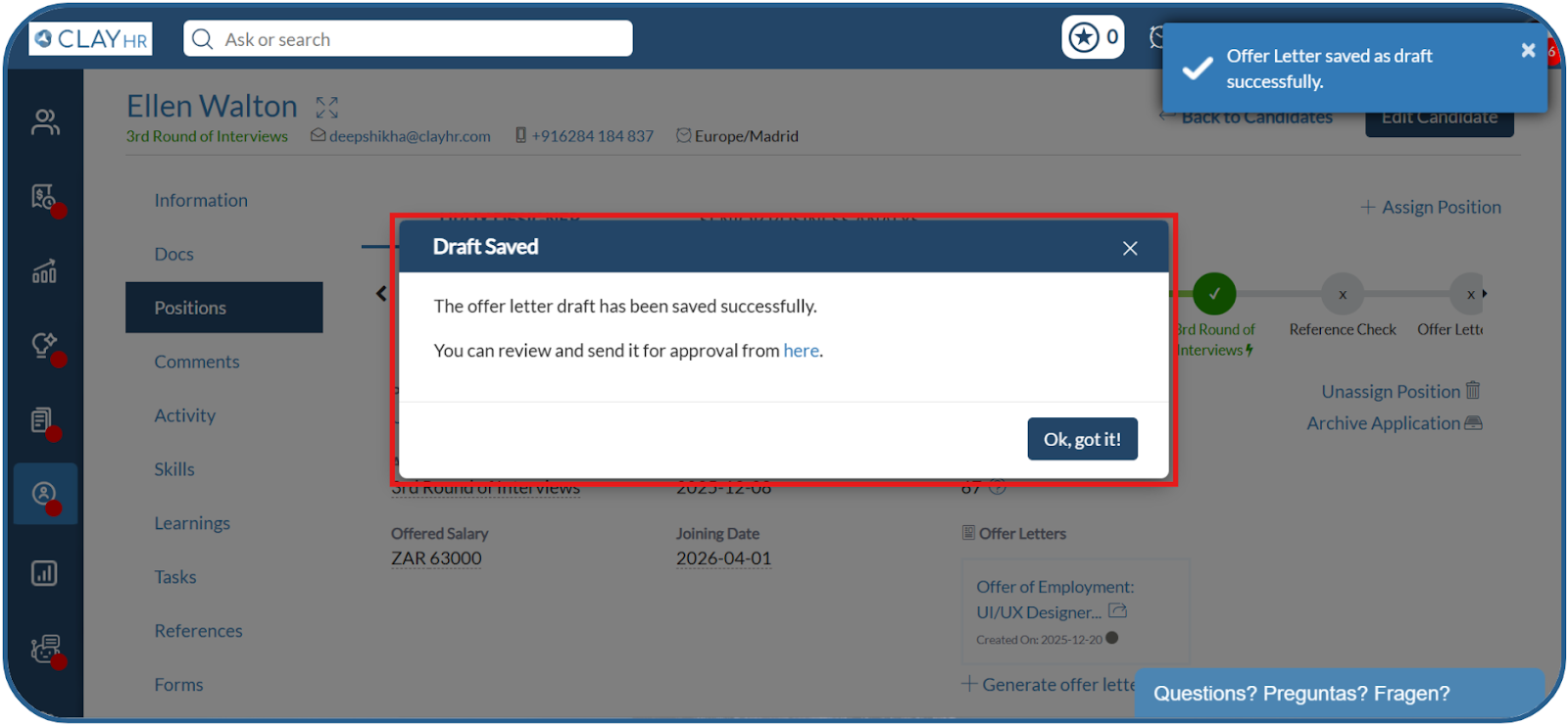ClayHR allows users to generate offer letters, save them as drafts, and complete the offer letter approval process before sending it to the candidate.
