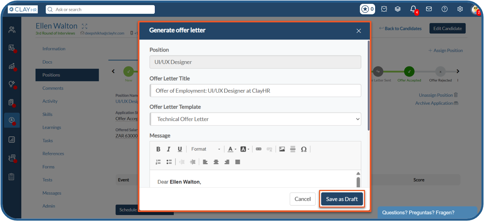Users can generate the offer letter for the position the candidate has applied for and save it as a draft.