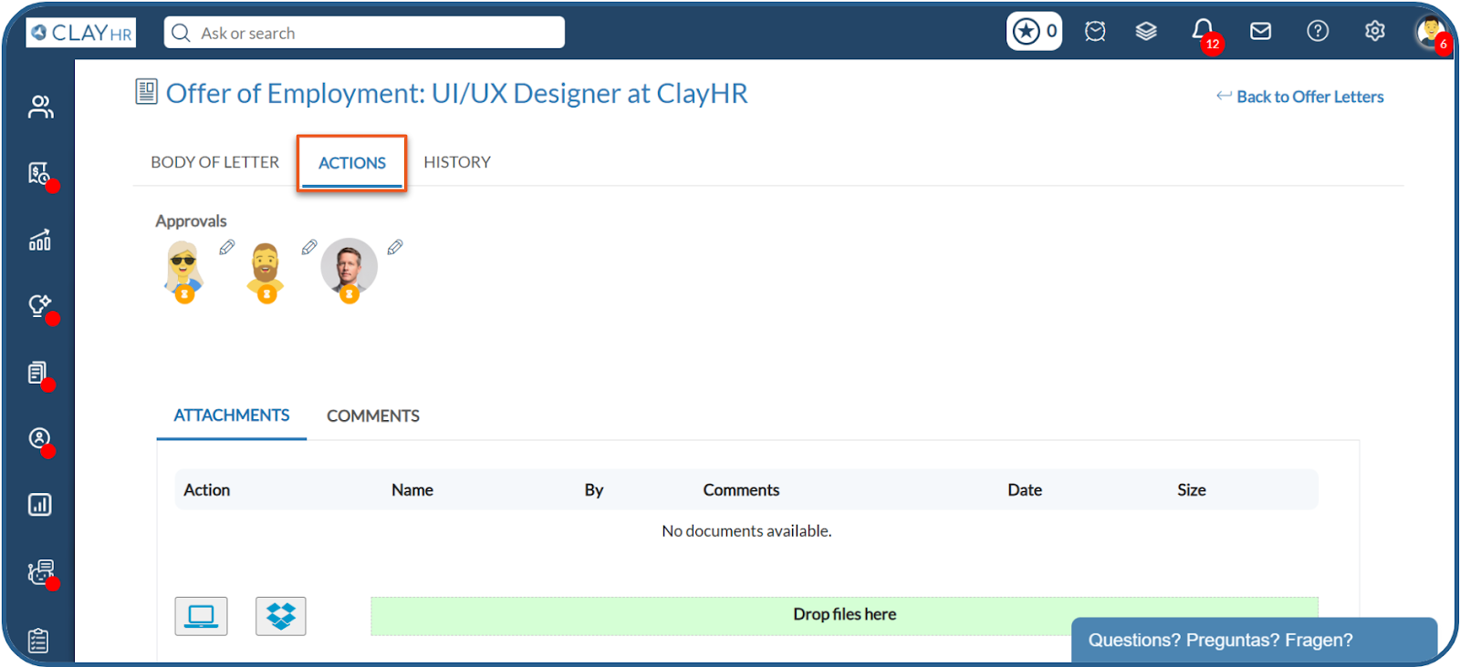 - Actions Tab: Allows users to complete the offer letter approval process and collaborate with other users. It includes the following sections: