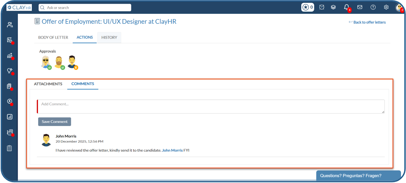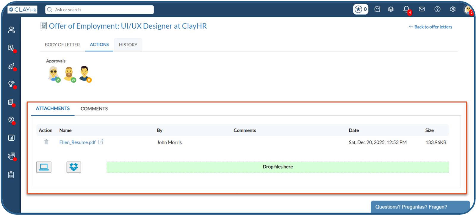 - Attachments: The Attachments section allows users to upload, view, and manage documents related to the offer letter or candidate.