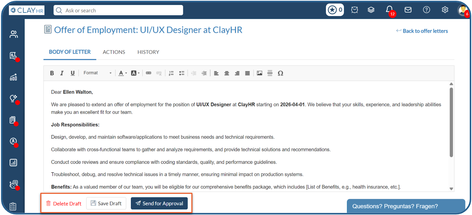 - Body of Letter: Allows users to view and edit the offer letter content and perform draft-level actions such as Save Draft, Delete Draft, or Send for Approval.