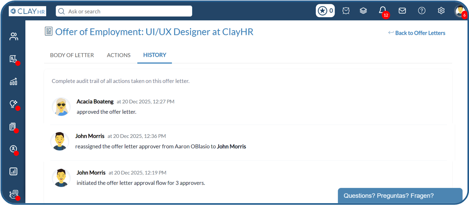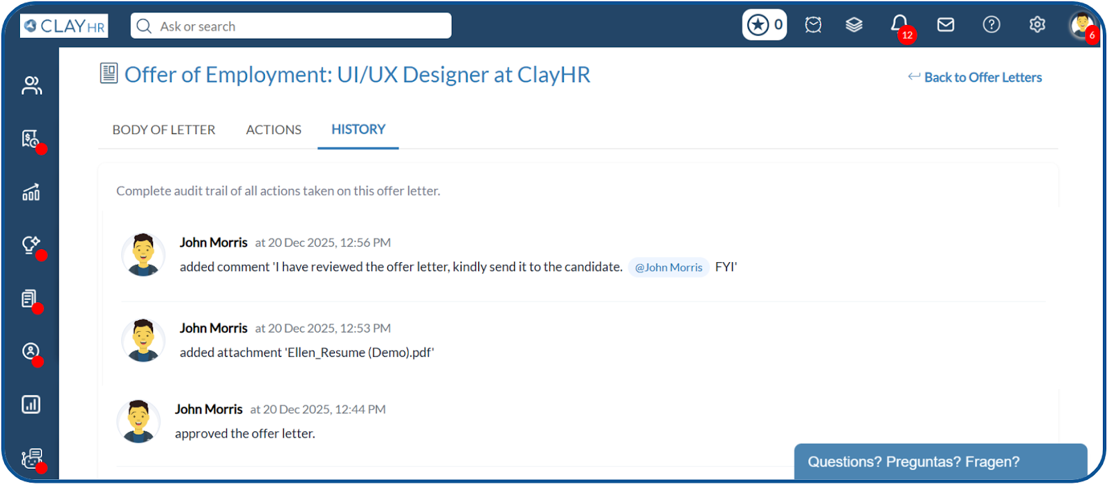 - History Tab: It provides a complete record of all activities related to the offer letter. It helps users track changes and actions taken on the offer letter. The system records the following activities: