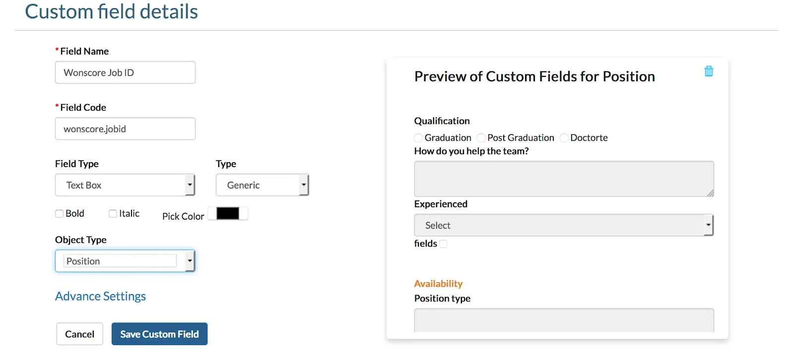 After configuring Wonscore in third-party integrations, set up a custom field.