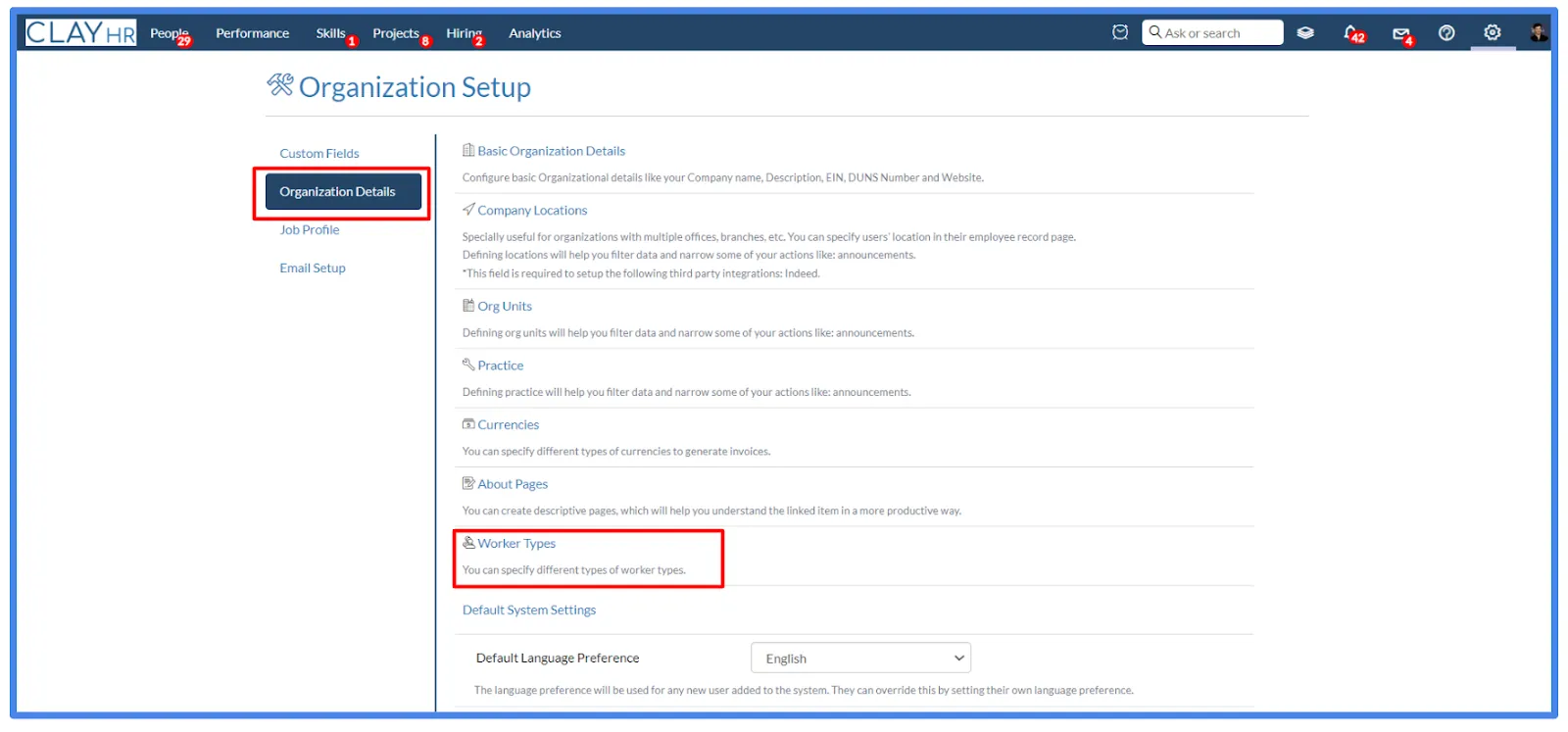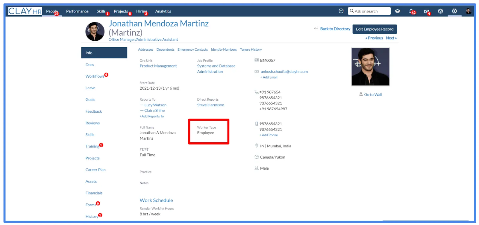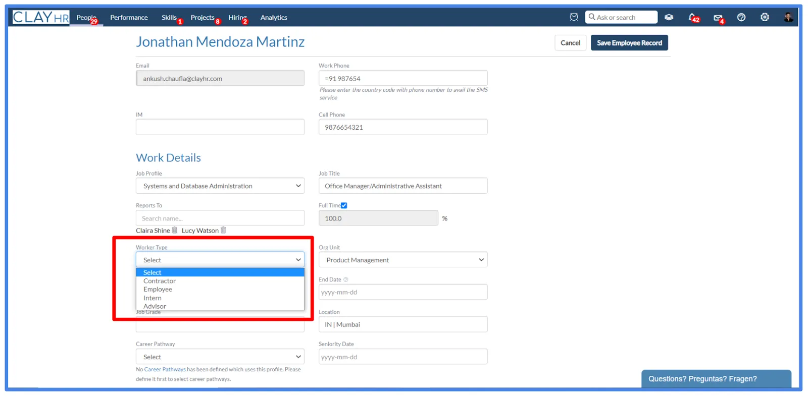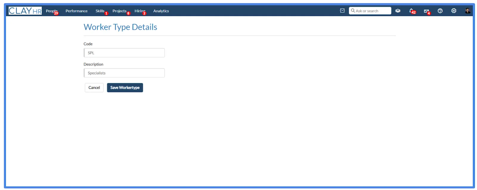 Common worker types are: Employee, Contractor, Intern, etc. That said, ClayHR allows you to define your own worker types.