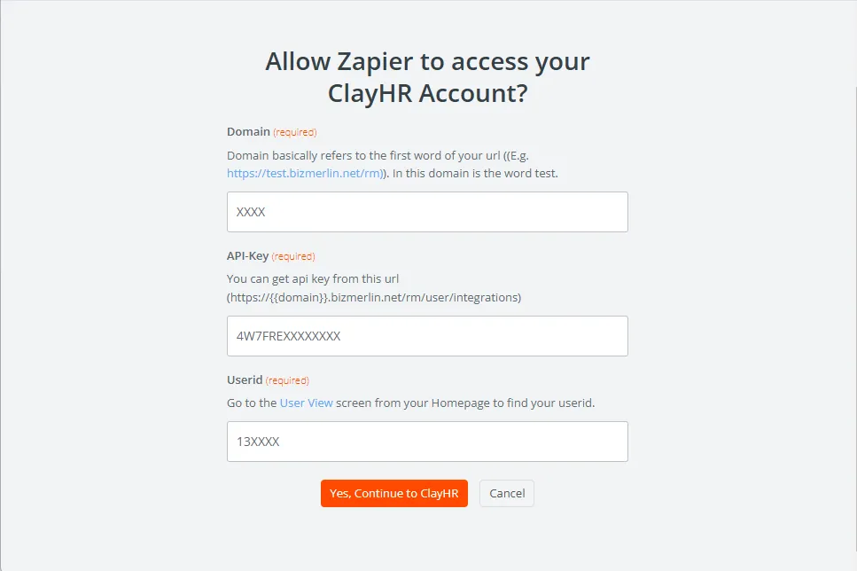 Zapier ClayHR involves Authentication followed by Zap creation The Authentication takes in input an API key, domain, and userid.