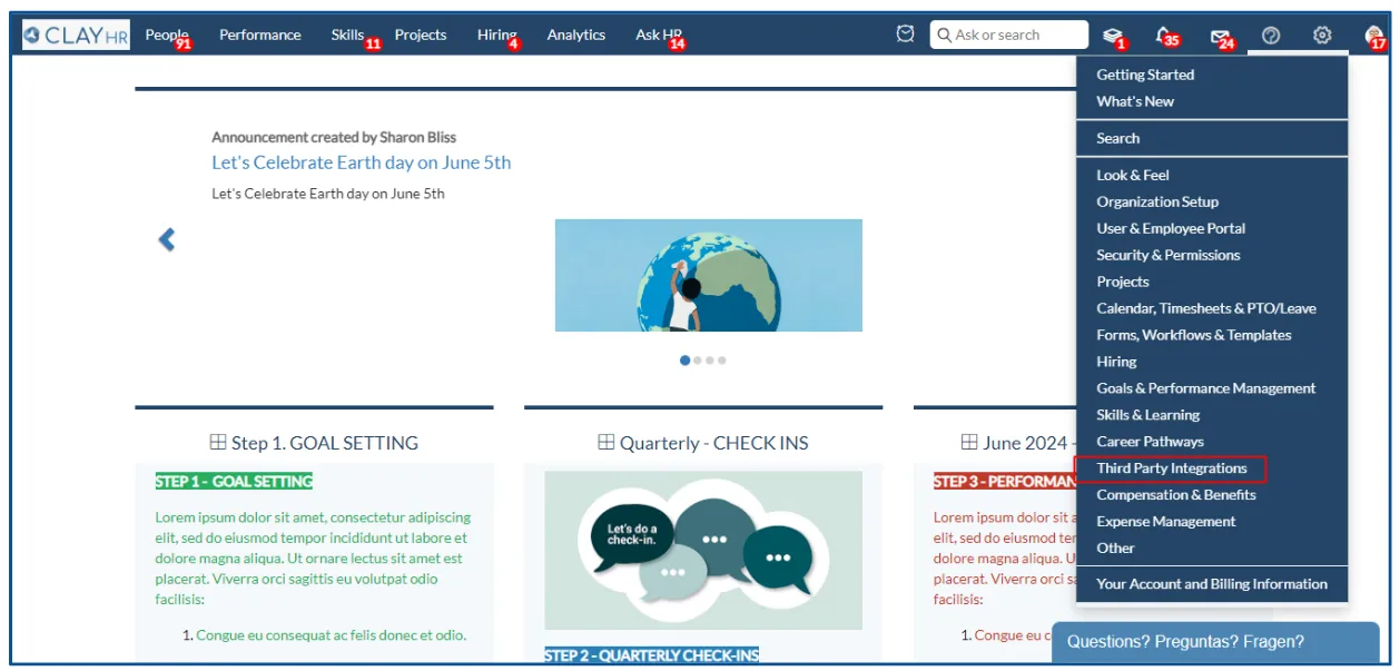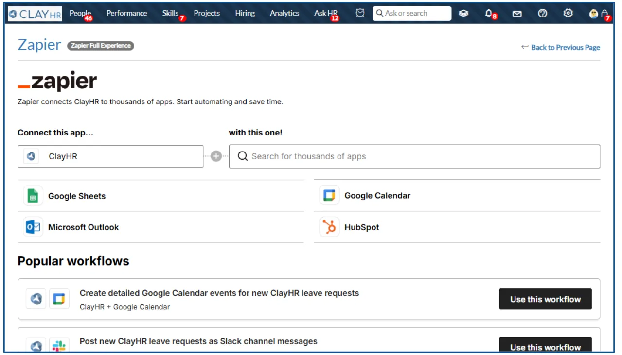 Zapier ClayHR provides robust integration options to integrate over 2000 applications with the ClayHR application. Users can create zaps and can use triggers with any other application. Users can get their API keys from the ClayHR portal and start using the Zapier services immediately. The calls follow the RESTful architecture and naming and are secured via https, just like calls from the web browsers.