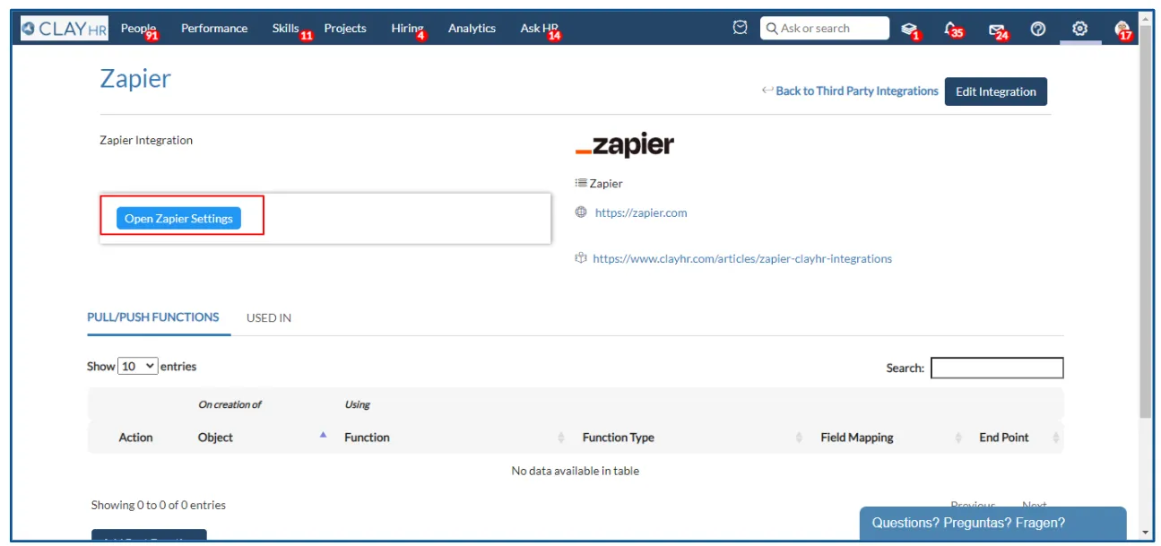 - On clicking “Open Zapier Settings” this page will appear and users can set up the zaps and even use the built in zaps.