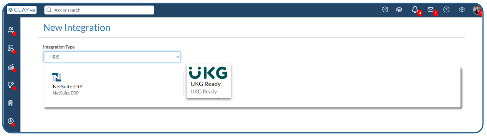 - From the Integration Type dropdown menu, select HRIS. A list of available integrations will appear—choose UKG Ready from the list.