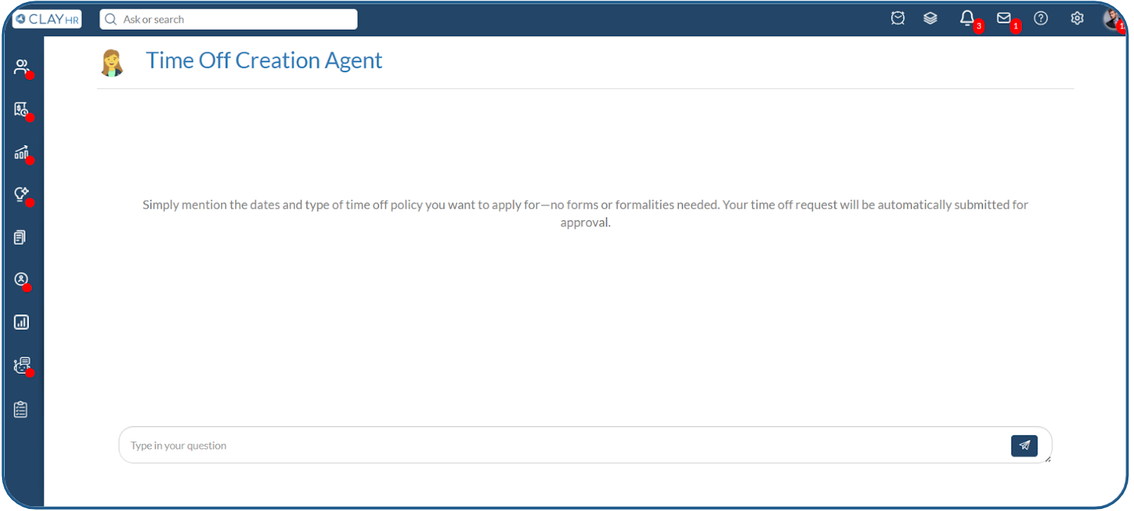 - Once the data is set up for the custom field in ClayHR, whenever a user creates a time-off request using the Time Off Creation agent, the request will be pushed to UKG Ready.