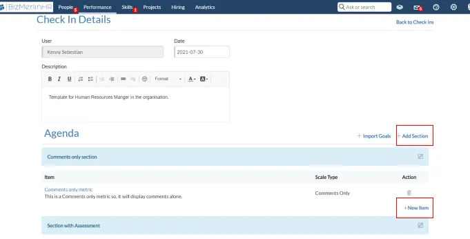 - You can add the sections and items to the template by clicking on the ‘+Add Section’ and ‘Add items’ respectively and click on the ‘save the agenda’ button.