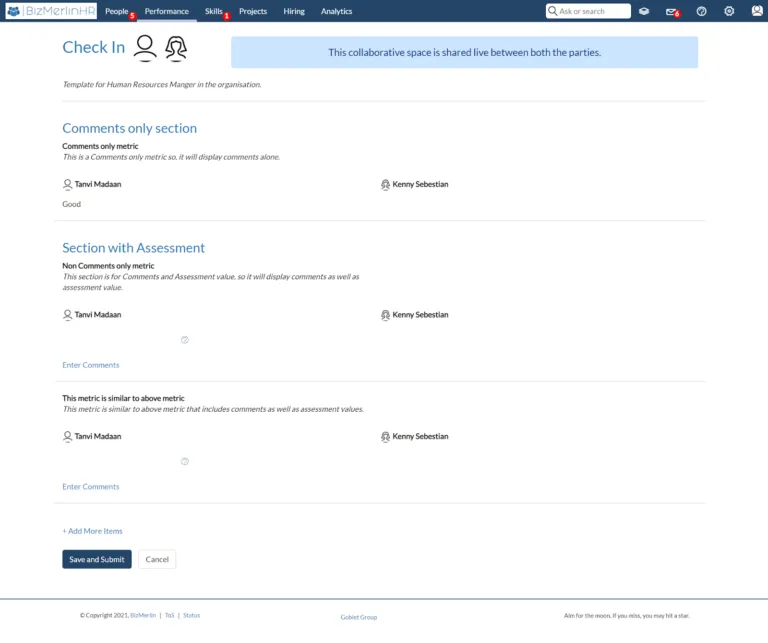 - Add the required comments and metrics for each item and click on the ‘Save and Submit’ button.