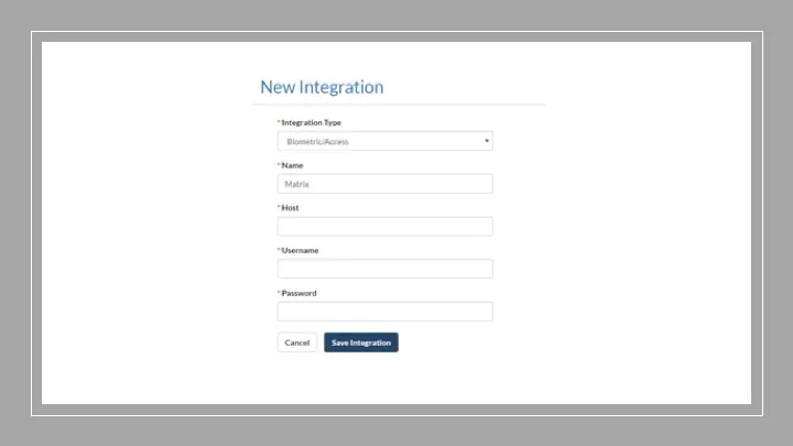 2. On the Third-Party Integrations page, click on the button “New Integration” and select “Biometric/Access” then choose “Matrix”.