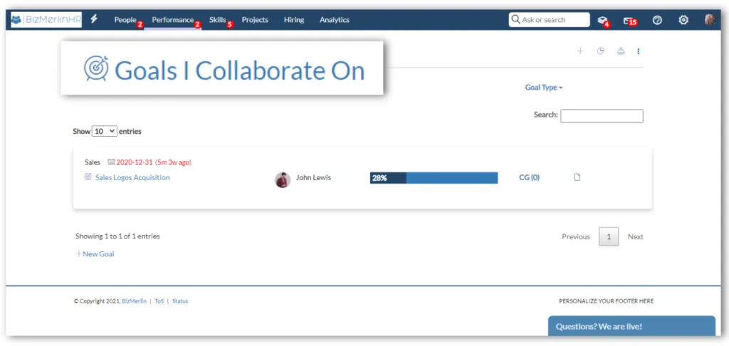 - To see all the goals that are assigned to you, go to the top menu “Goals” under the Performance tab and click on the sub-menu “My Goals”.