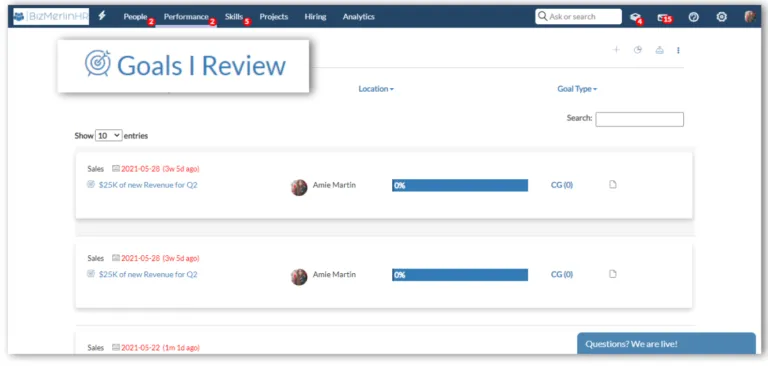 - To see all the goals you review, go to the top menu “Goals” under the Performance tab and click on the sub-menu “My Reviews”.