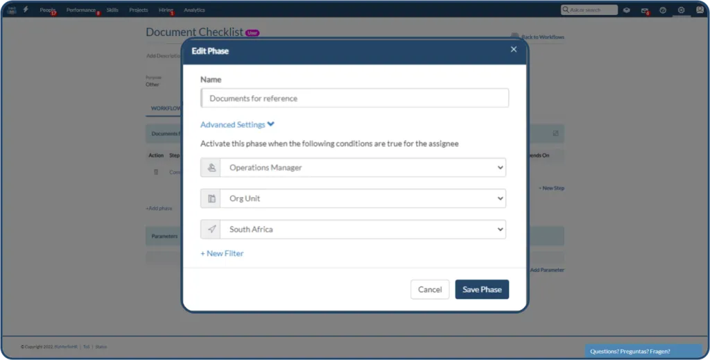 For example, the phase name is set as “Documents for reference” and should only be available to the users whose profile is “Operations Manager” and are from “South Africa”.
