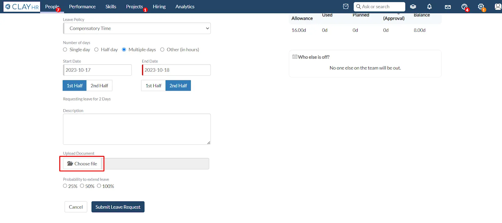 - Click on the “Submit Leave Request” button and the leave will be applied.
