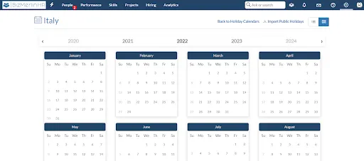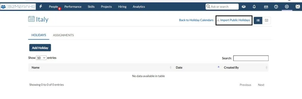 5. In Holiday Calendar, if you want to add the public holidays of a respective country, click on the ‘Import Public Holidays’ link in the top-right corner of the page.
