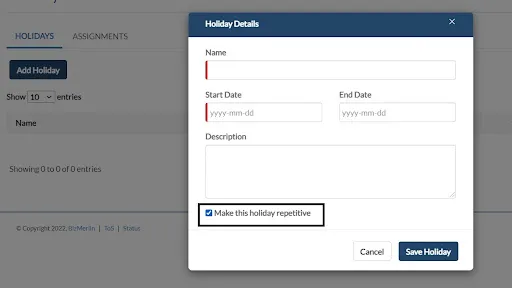 8. On clicking the checkbox below the description, you can make a holiday repetitive for the next 5 years.