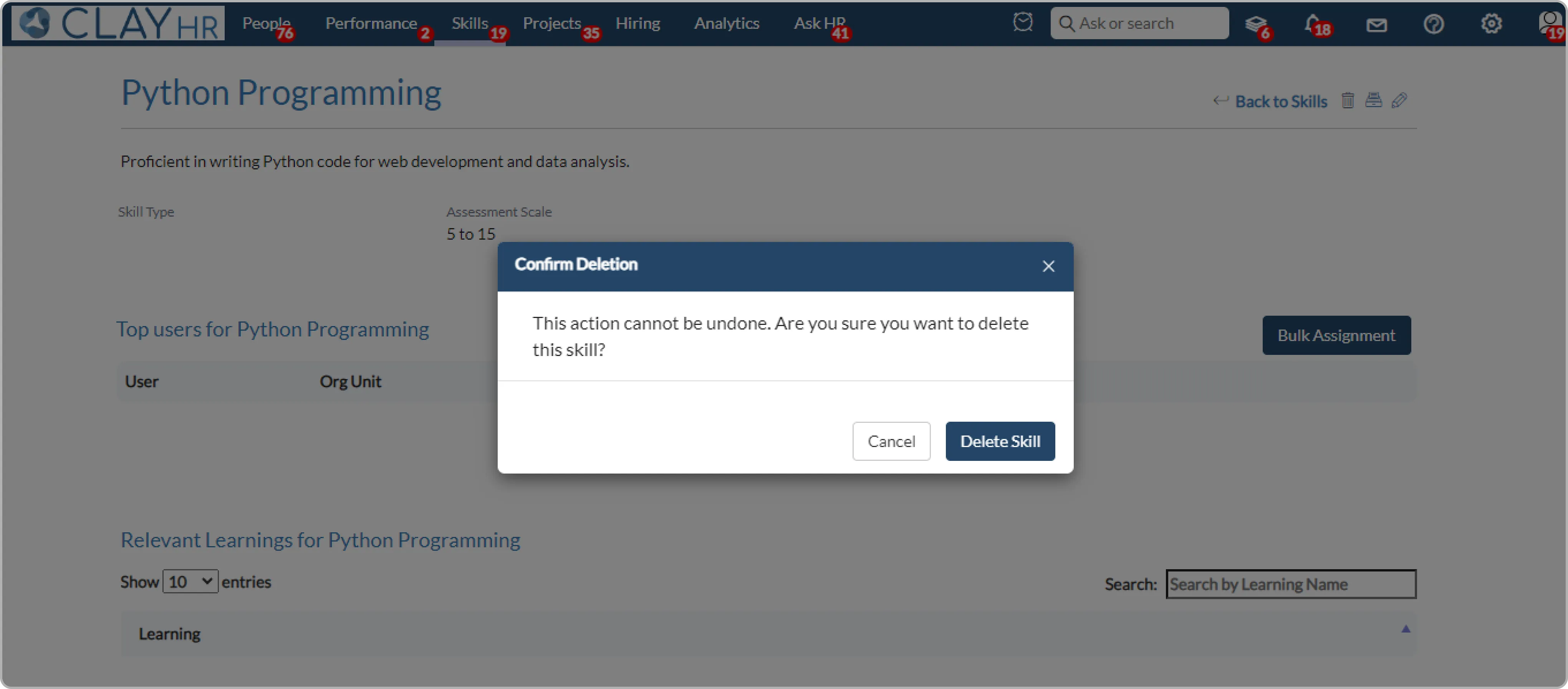 - Clicking on the trash icon, a pop-up to confirm deletion will appear. Click on the “Delete Skill” button to delete the skill.
