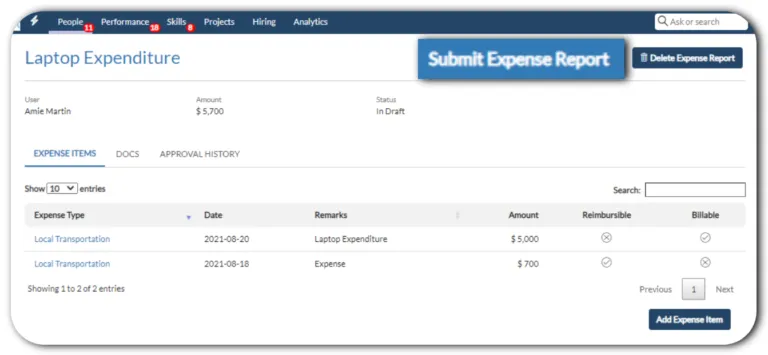 - After, adding various items to your report you can submit that for approval from the top right by clicking on the “Submit Expense Report” button.