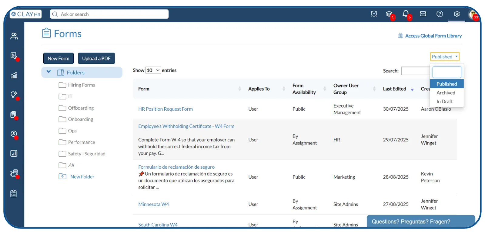 - Use the Status filter (Published, Archived, or In Draft) to find the desired form.