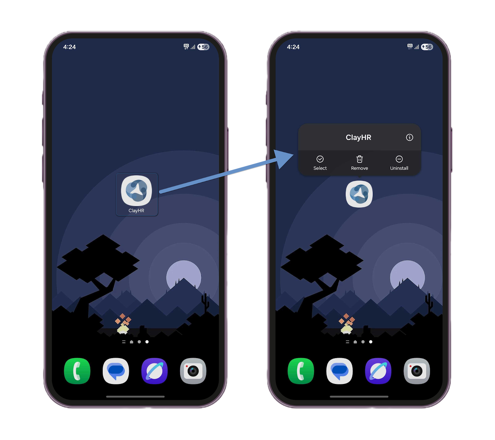 1. Mantén pulsado el icono de la aplicación ClayHR en la pantalla de inicio o en el cajón de aplicaciones hasta que aparezca un menú.
