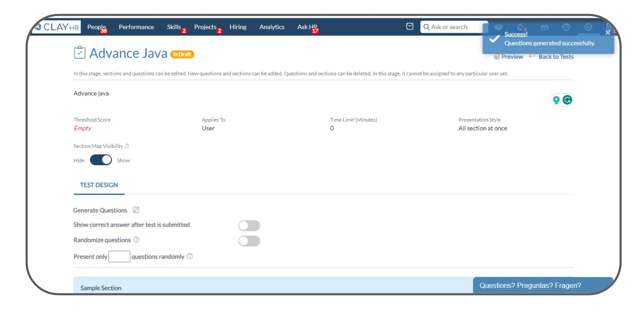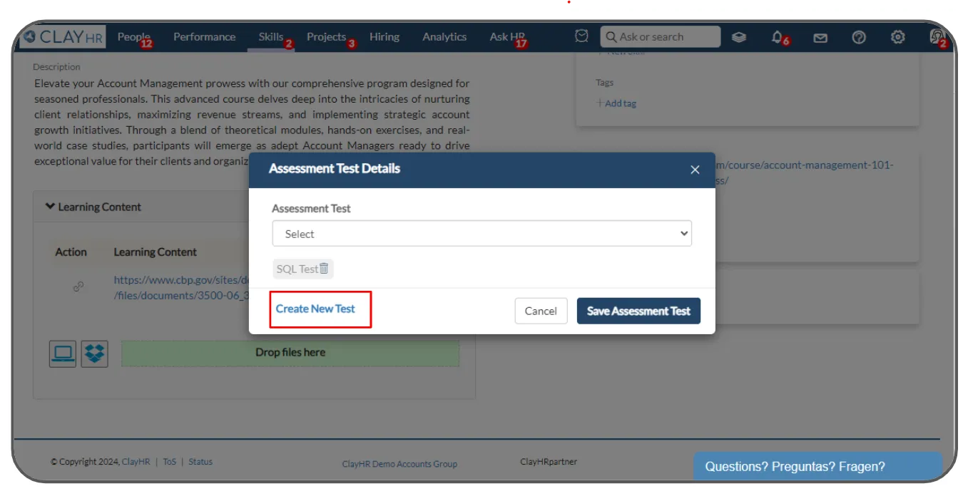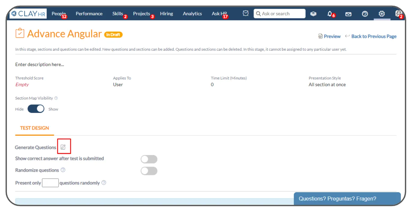 The process of generating tests is effortless with ClayHR’s advanced automated question-generation feature. Utilizing the power of AI, users can generate questions seamlessly based on the content and YouTube links uploaded in a learning. This innovative functionality streamlines the question-generation process and ensures that the questions generated are contextually relevant and diverse. In this kB article, we'll guide you through the AI-driven question generation in tests.