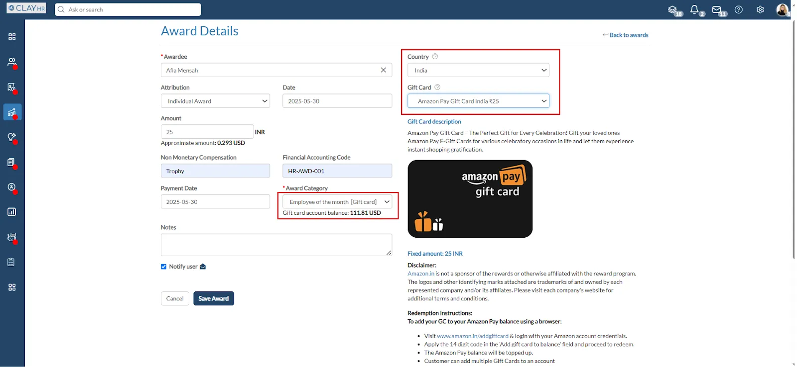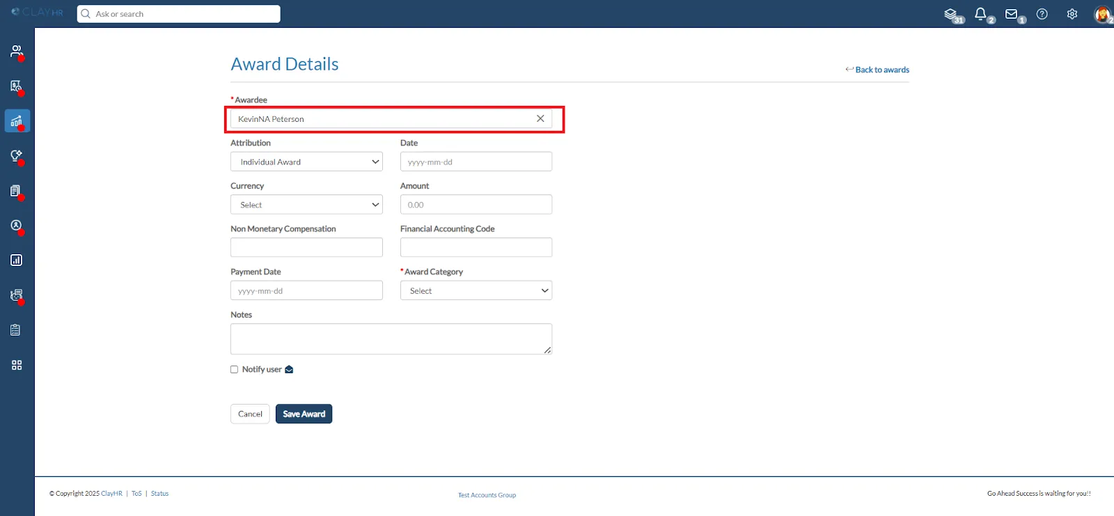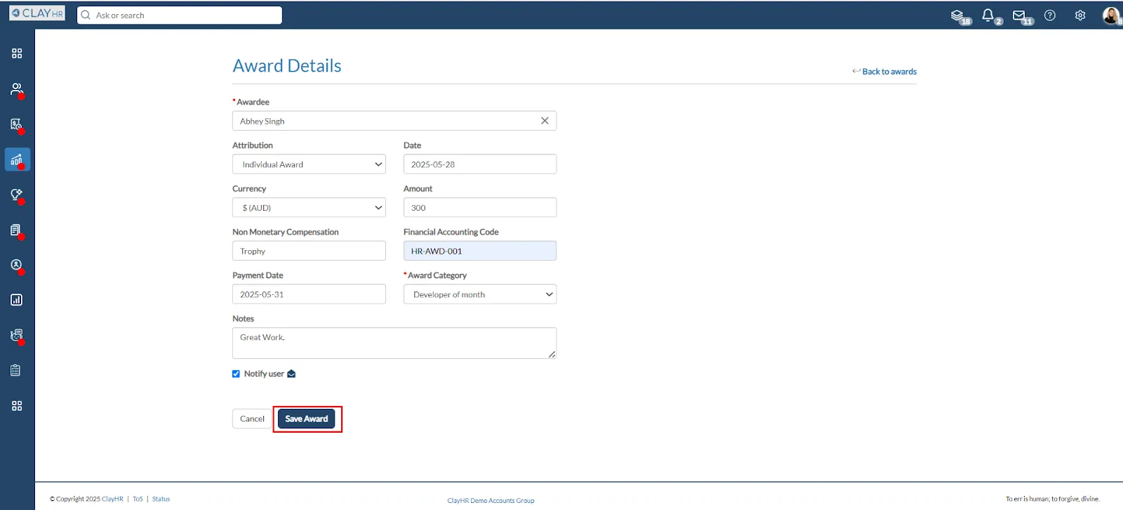 - Check the checkbox to send an email notification to the employee receiving the award.