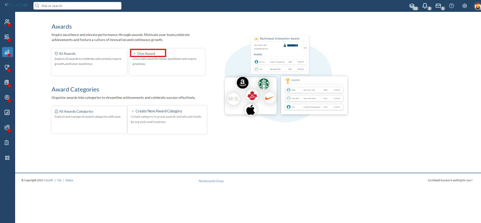 With ClayHR, you can give awards to anyone in your organization. Use the 'Give Awards' option to choose, customize, and send awards. To give an award to a user, follow the steps below: