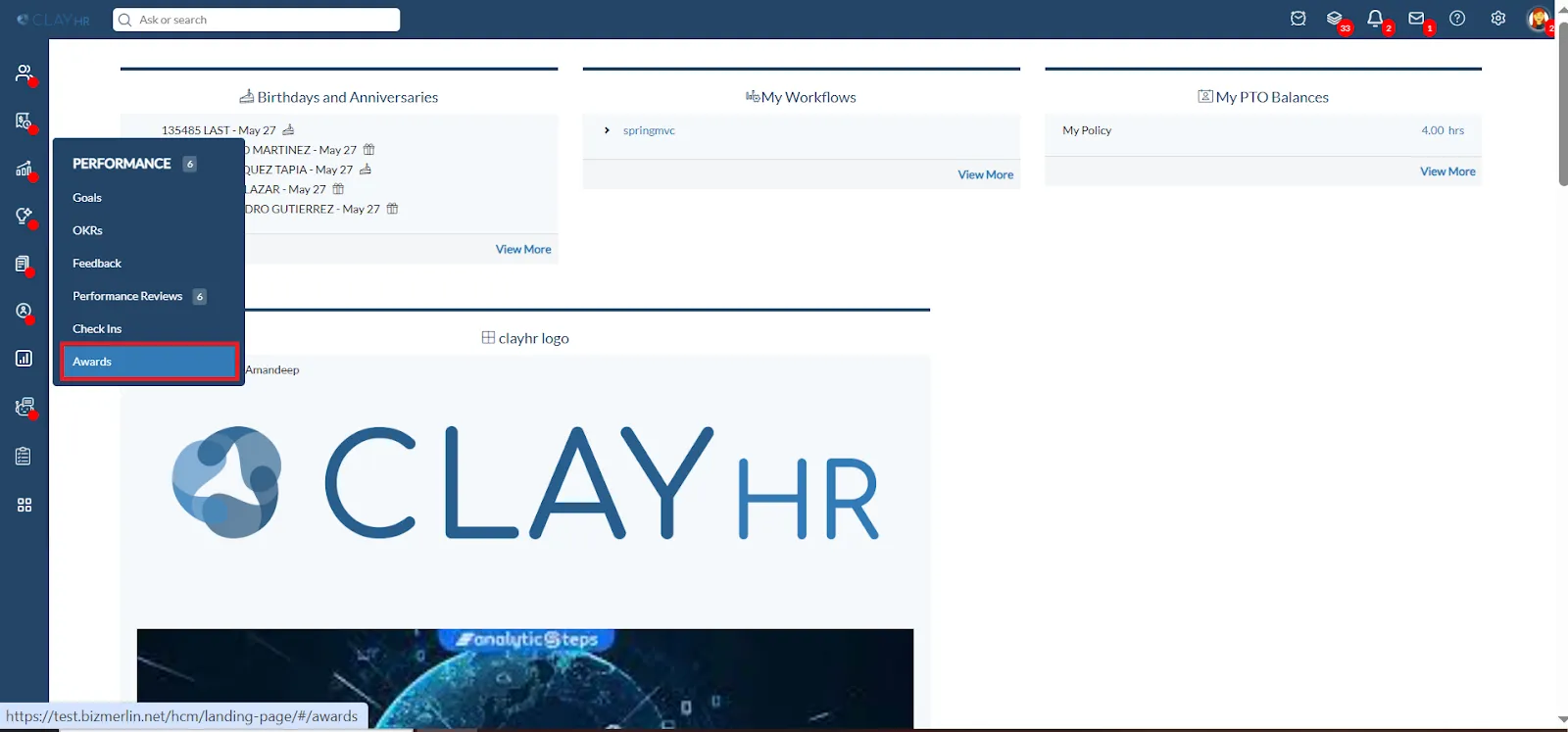 - Hover over the "Performance" icon in the left menu, then select “Awards”.