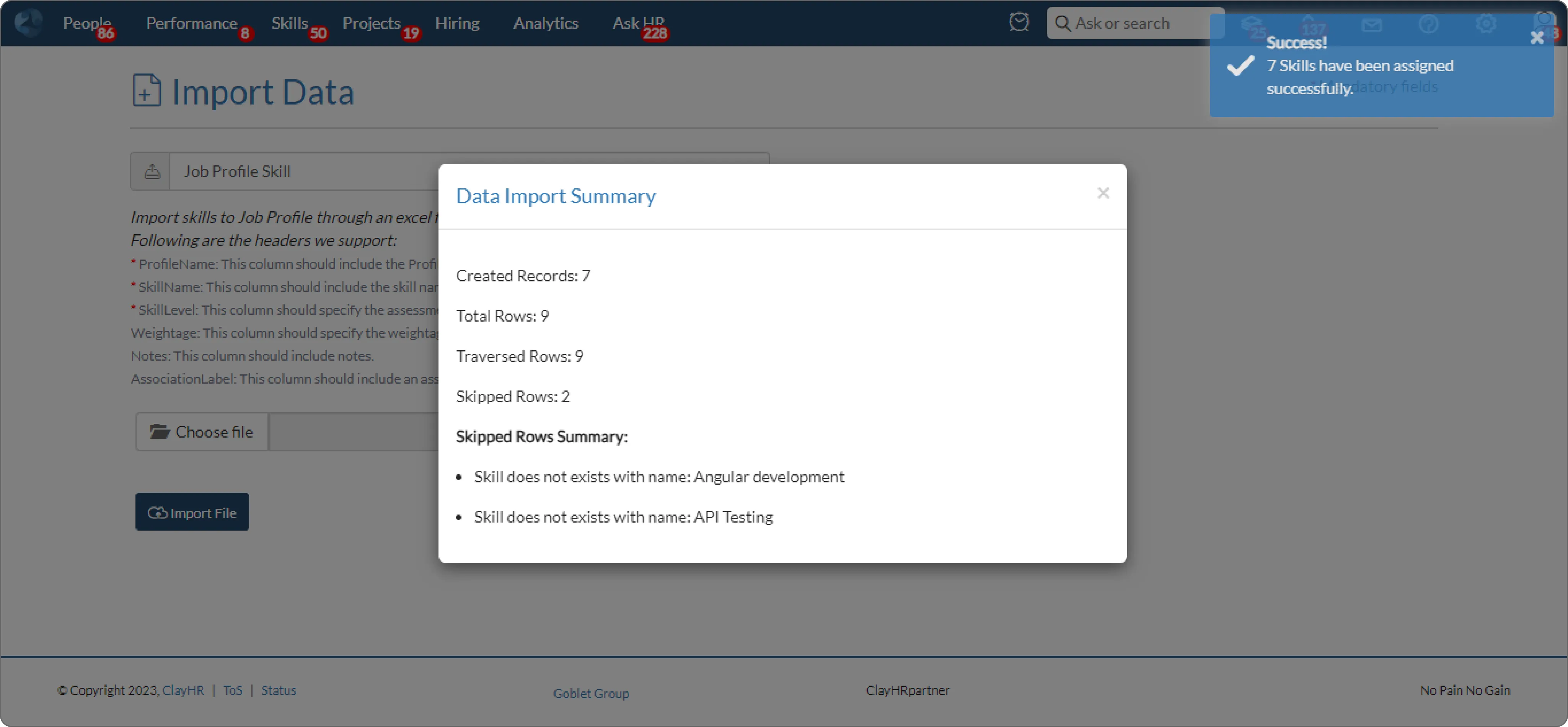 - Click on the “Import File” button. Once the file is imported, a toaster message appears along with a popup window that shows the data import summary.