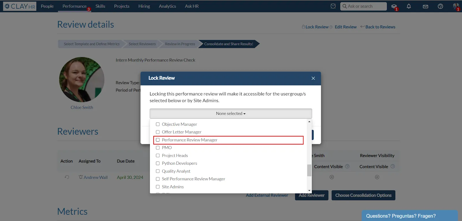 Note: The selected user groups must have the “Performance Review Administration” permission.