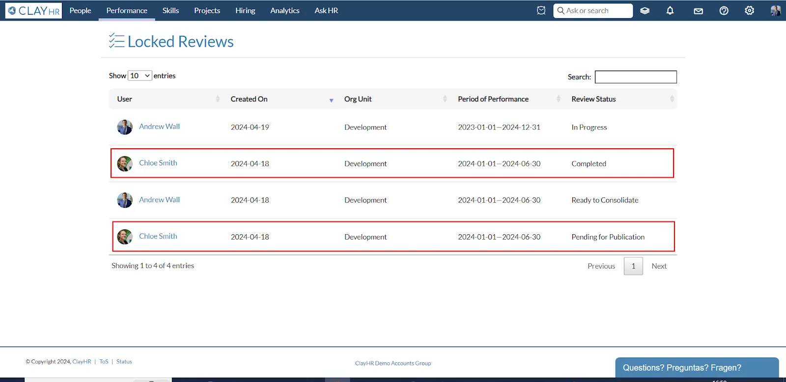 - To unlock a performance review, simply click on the "Lock icon" associated with the selected review.