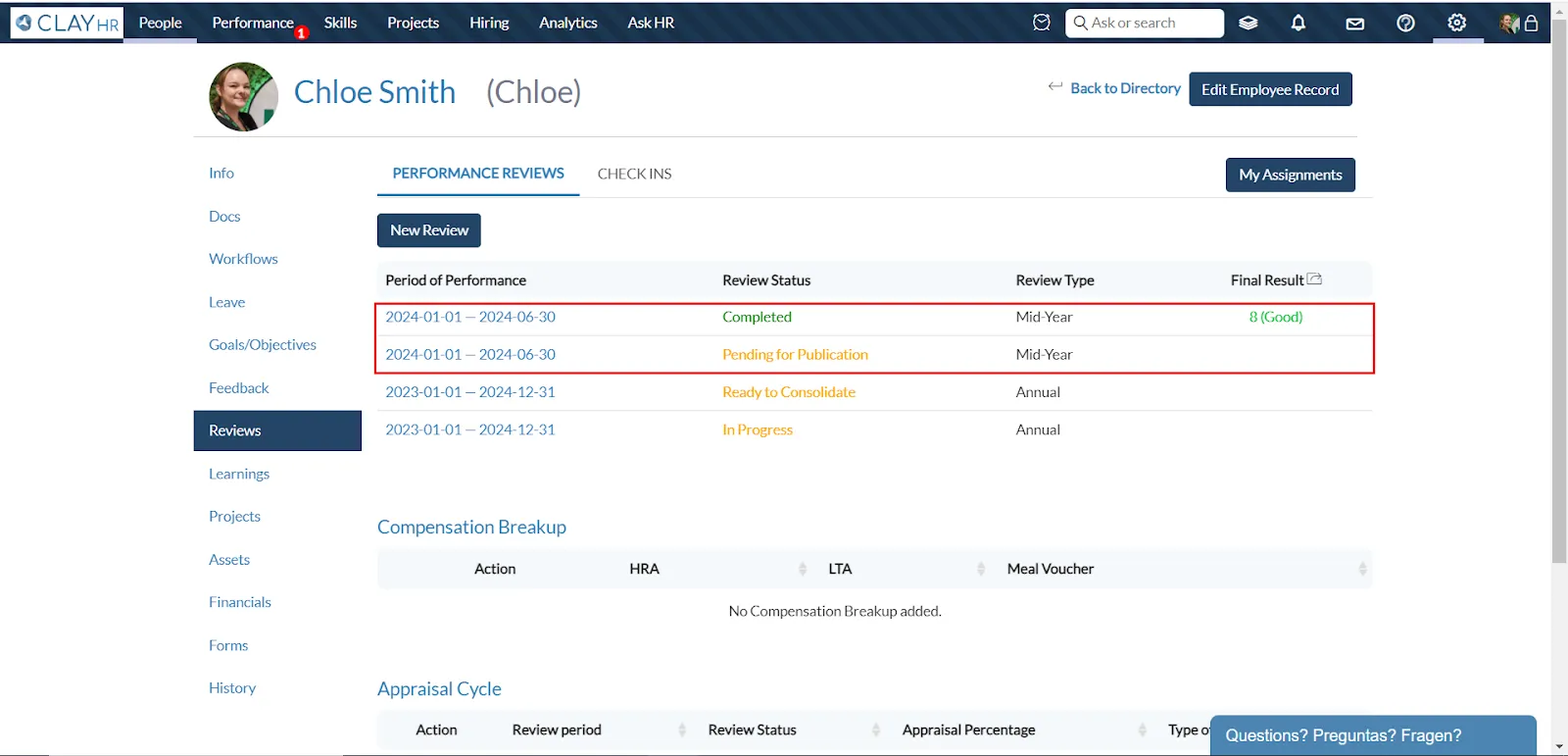 For instance - In some organizations, the performance reviews of all employees, across all levels of hierarchy are typically handled by the HR team. However, the reviews of certain employees may need to be kept restricted from even the members of the HR team. Therefore, in such cases, the reviews can be locked by the site admin.