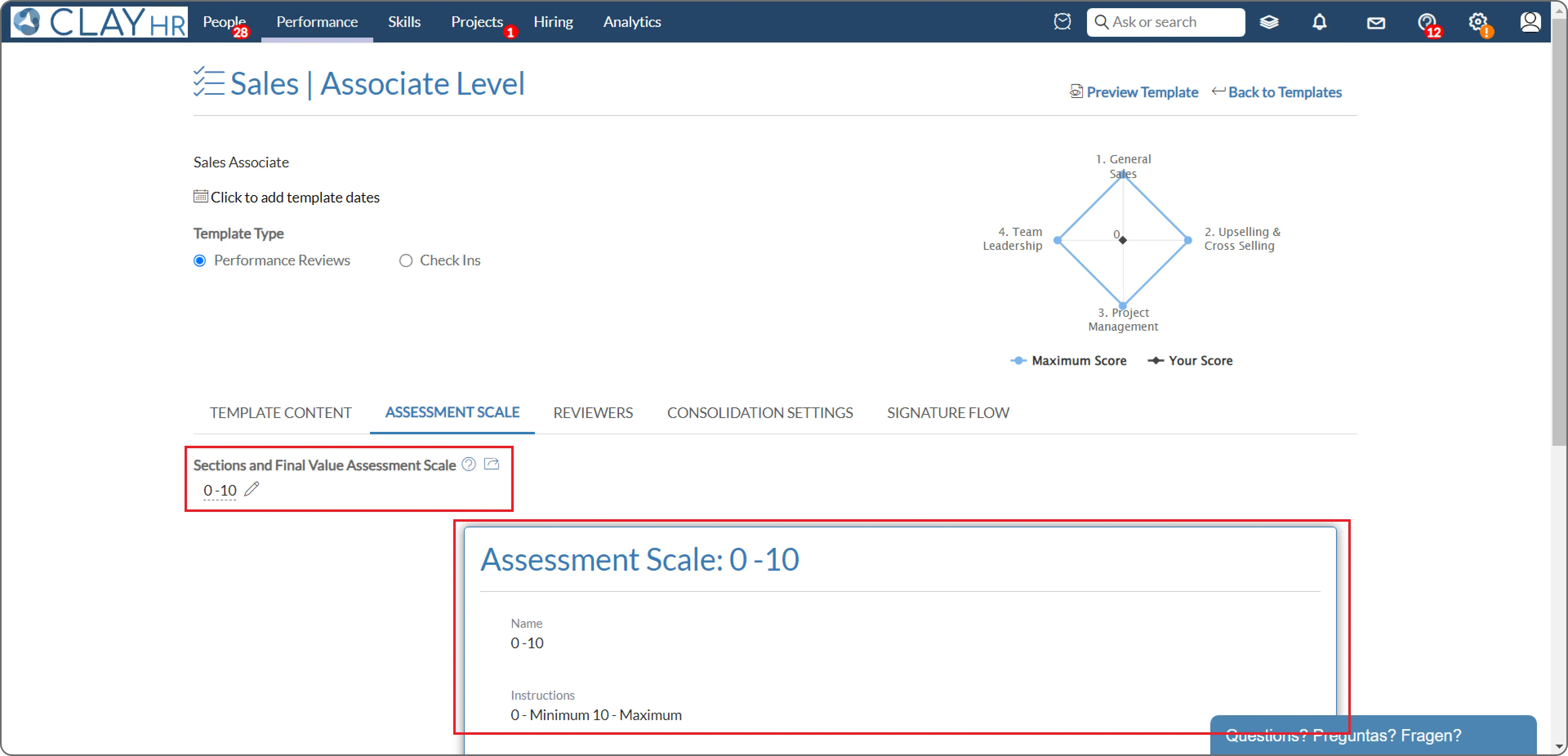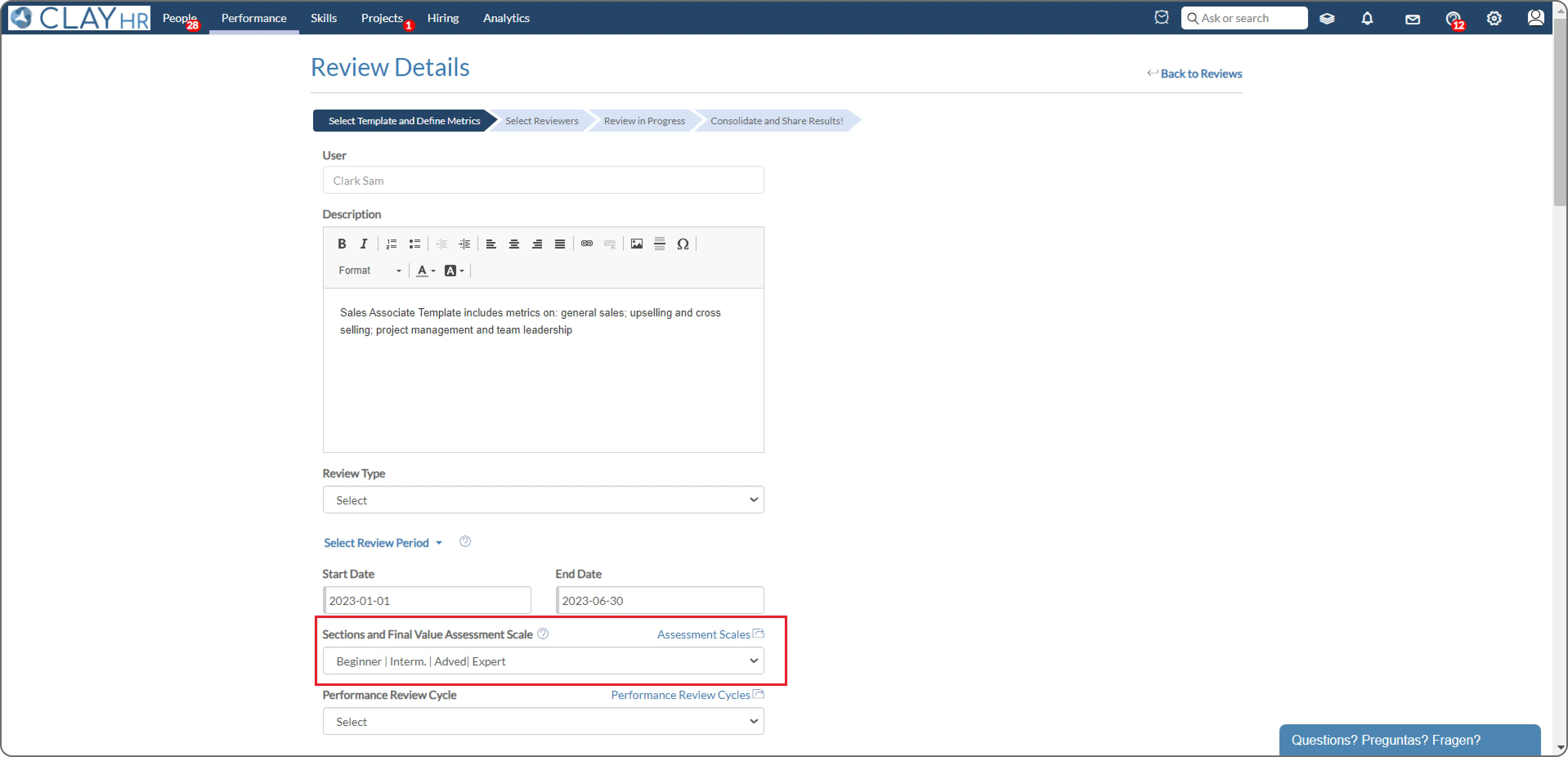 - When setting Sections and Final Value Assessment Scale in a new Template for Performance Reviews. The results of Performance Reviews are calculated using the chosen assessment scale, separate from the scales used for individual metrics, goals, and skills. This scale determines the total score and interpretation for the review by taking into consideration the scale of each metric of overall sections and calculating it in the selected Sections and Final Value Assessment Scale.